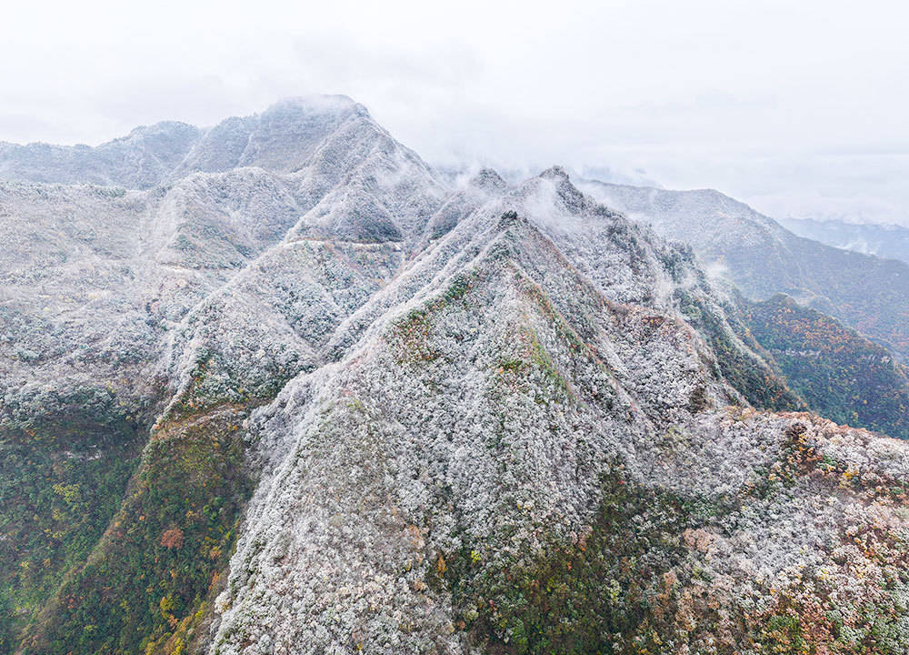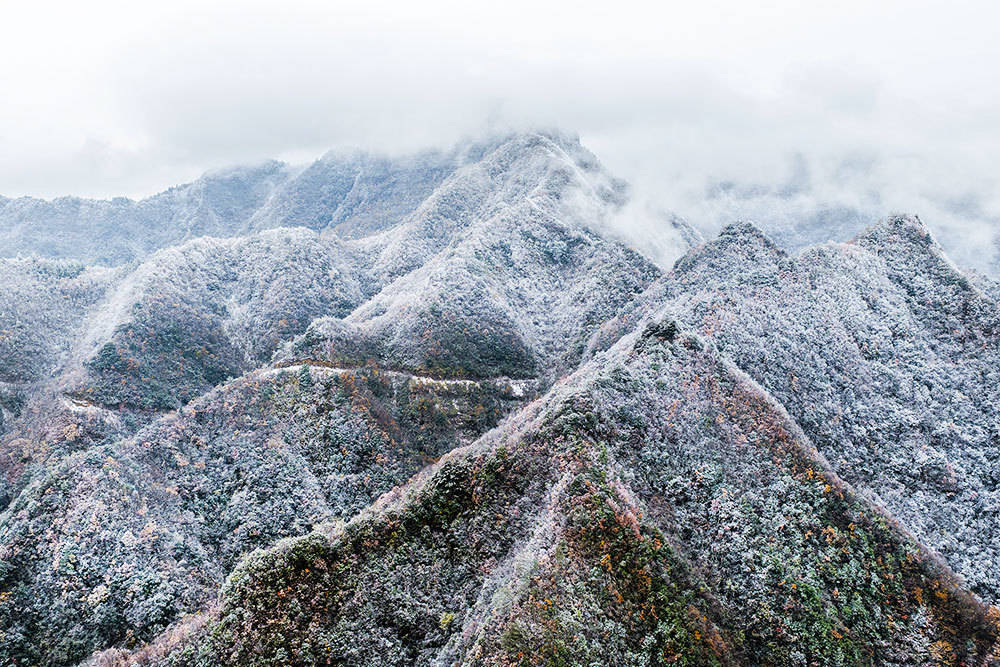 霜雪轻覆山野,秋色未褪的林木在云雾中若隐若现,宛如水墨丹青。