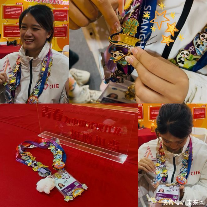 对她而言,进博会不仅是服务平台,更是情感交流的港湾。她珍爱交换来的各式徽章,其中那枚国展中心金色徽章尤为特别。“这枚徽章很稀有。”她回忆道,“当时和我交换徽章的那位工作人员姐姐笑着说:‘港澳台的小叶子,就是要宠着!’这句话让我感到特别温暖。”一枚小小的徽章,一句暖心的话语,成了珍贵情谊最生动的诠释。